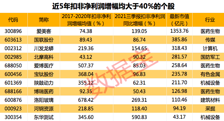 将时间区间放宽来看,468股自2017年以来连续五年扣非净利润实现正增长,这其中仅11股连续五年扣非净利润增速均超过40%(2021年增速为三季报数据,其余年份为年报数据),业绩保持稳定的长线成长,穿越牛熊。