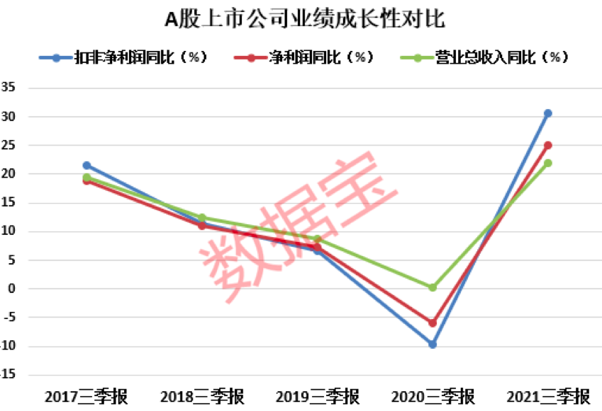 证券时报·数据宝统计,剔除10月以来上市新股,前三季度A股上市公司整体营业收入同比增长22.02%,净利润同比增长25.03%,扣非净利润同比增长30.55%,这三项成长指标均创下历史同期最高水平。