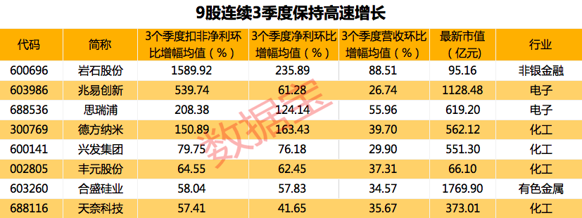 9家上市公司连续3个季度实现成长指标均超20%高增长,其中4股来自化工行业,行业高景气度直接利好相关个股业绩,可以说,化工股是今年成长最快的板块。