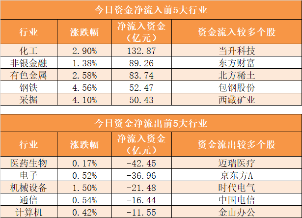 28个申万一级行业中,17个行业实现资金净流入,其中化工行业净流入132.87亿元居首。