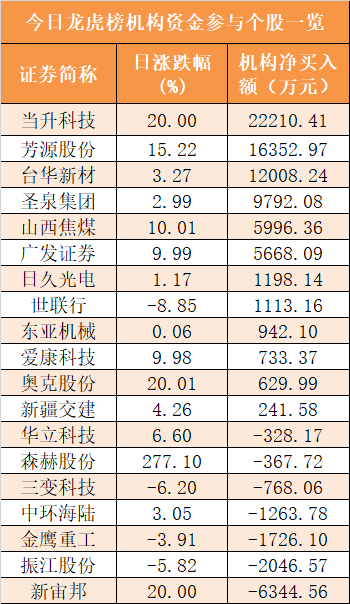 盘后龙虎榜数据显示,机构现身19股,其中当升科技等12股呈现机构资金净买入,新宙邦等7股呈现机构资金净卖出。