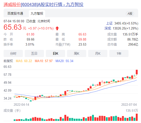 其中最为引人关注的便是光伏龙头通威股份尾盘封死涨停,底部反弹累计91%,股价创历史新高,整体市值也逼近3000亿大关。