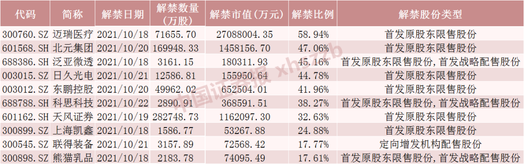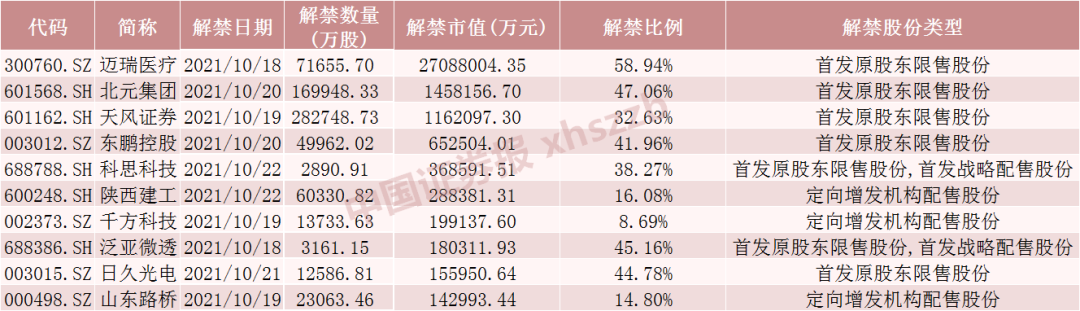 从解禁股情况来看,迈瑞医疗、北元集团、天风证券将解禁金额超100亿元,北元集团、东鹏控股、泛亚微透、日久光电、科思科技、迈瑞医疗流通盘将增加超100%。