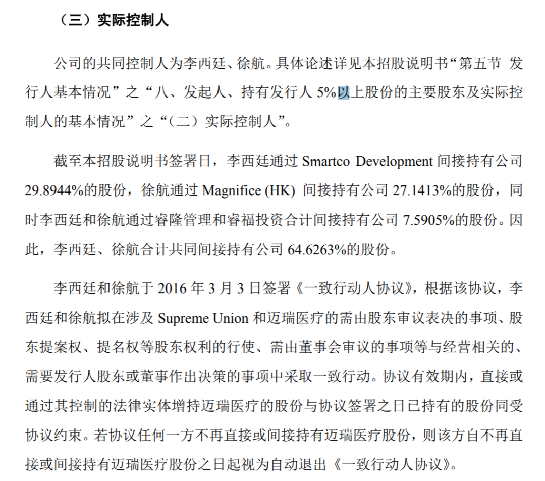 在迈瑞医疗招股说明书中提到,迈瑞医疗实控人为李西廷、徐航,李西廷持有Smartco Development Limited100%的股份,徐航持有Magnifice(HK) Limited100%的股份。