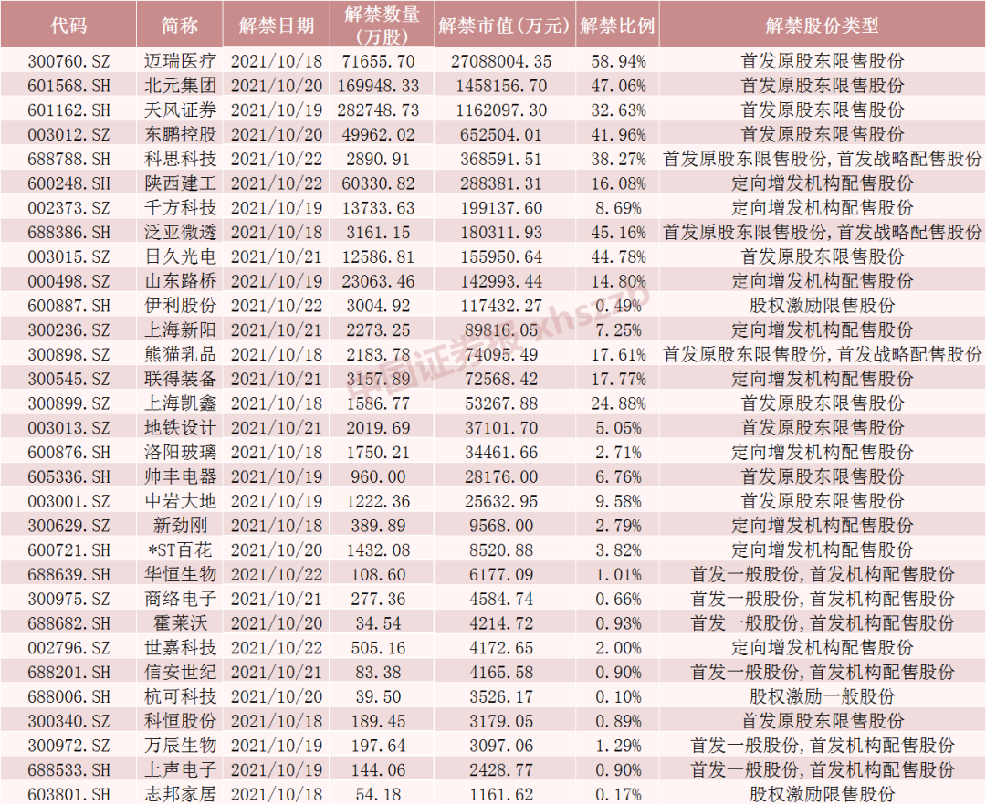 Wind数据显示,迈瑞医疗10月18日将解禁7.17亿股,均为首发原股东限售股份。北元集团10月20日将解禁16.99亿股,均为首发原股东限售股份。天风证券10月19日将解禁28.27亿股,均为首发原股东限售股份。