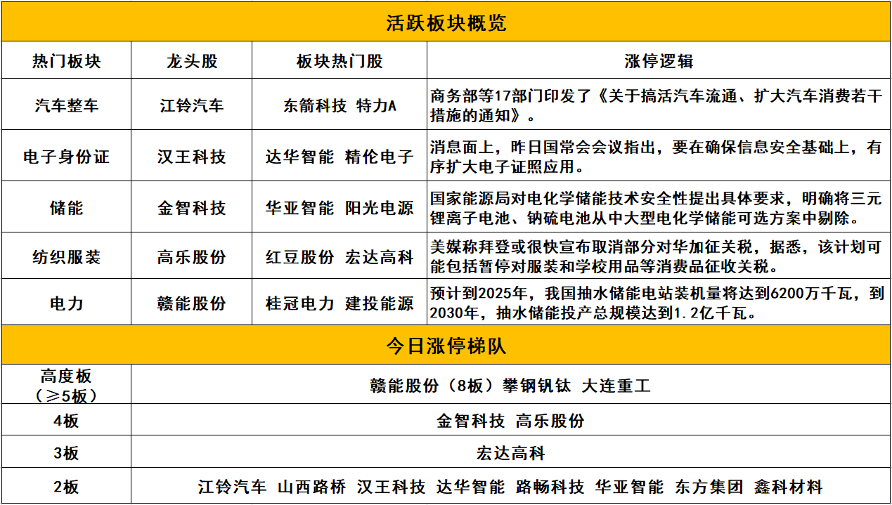 个股方面,电力股赣能股份8板,钒电池概念股攀钢钒钛5板,业绩超预期的大连重工5板,储能板块金智科技4板、华亚智能2板。