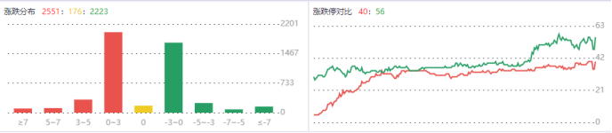 整体来看,市场今天又是日内震荡,指数层面上,沪指略有反弹,科创50横盘。个股层面上,涨跌互半,但跌停板数量达到了56家,直接就超过了涨停数量,表明市场局部恐慌情绪较强。