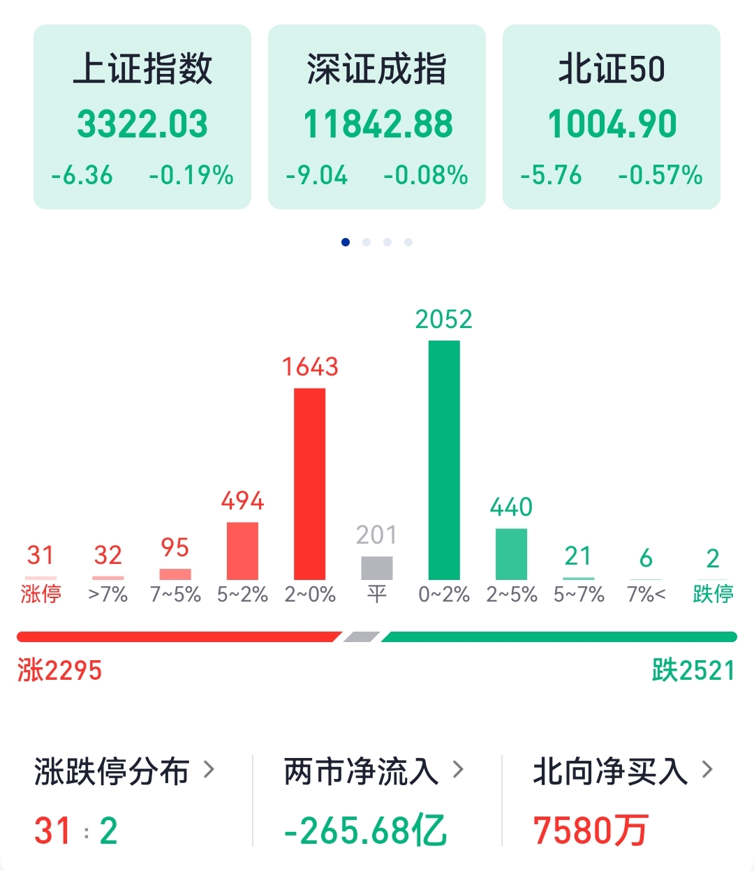 总体上个股跌多涨少,两市超2500只个股下跌;沪深两市今日成交额9509亿,较上个交易日放量814亿;北向资金全天净买入0.76亿元。