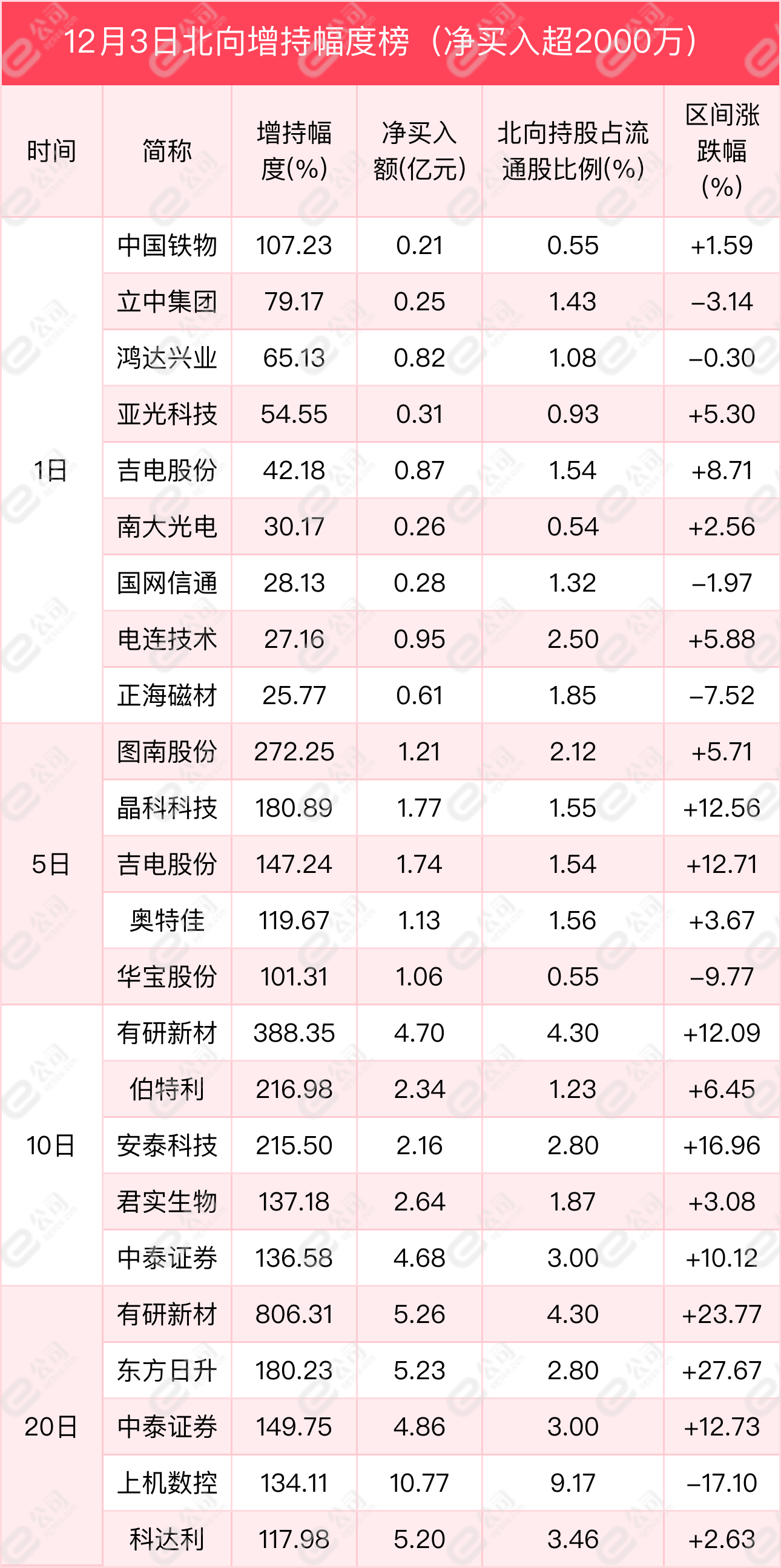从增减持幅度来看,单日净买卖超2000万元以上的个股中,中国铁物、立中集团、鸿达兴业获北向资金增持幅度居前,分别为107.23%、79.17%、65.13%。