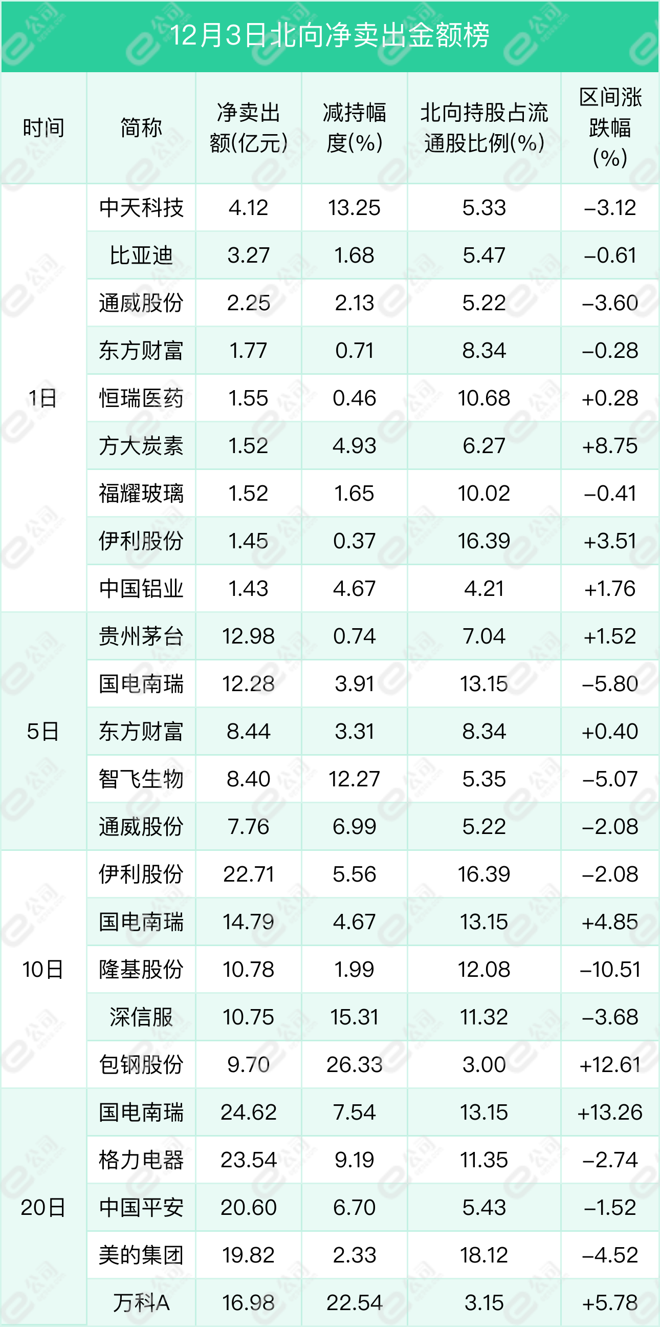 中天科技、比亚迪、通威股份遭北向资金净卖出金额居前,分别为4.12亿元、3.27亿元、2.25亿元,减持幅度分别为13.25%、1.68%、2.13%。