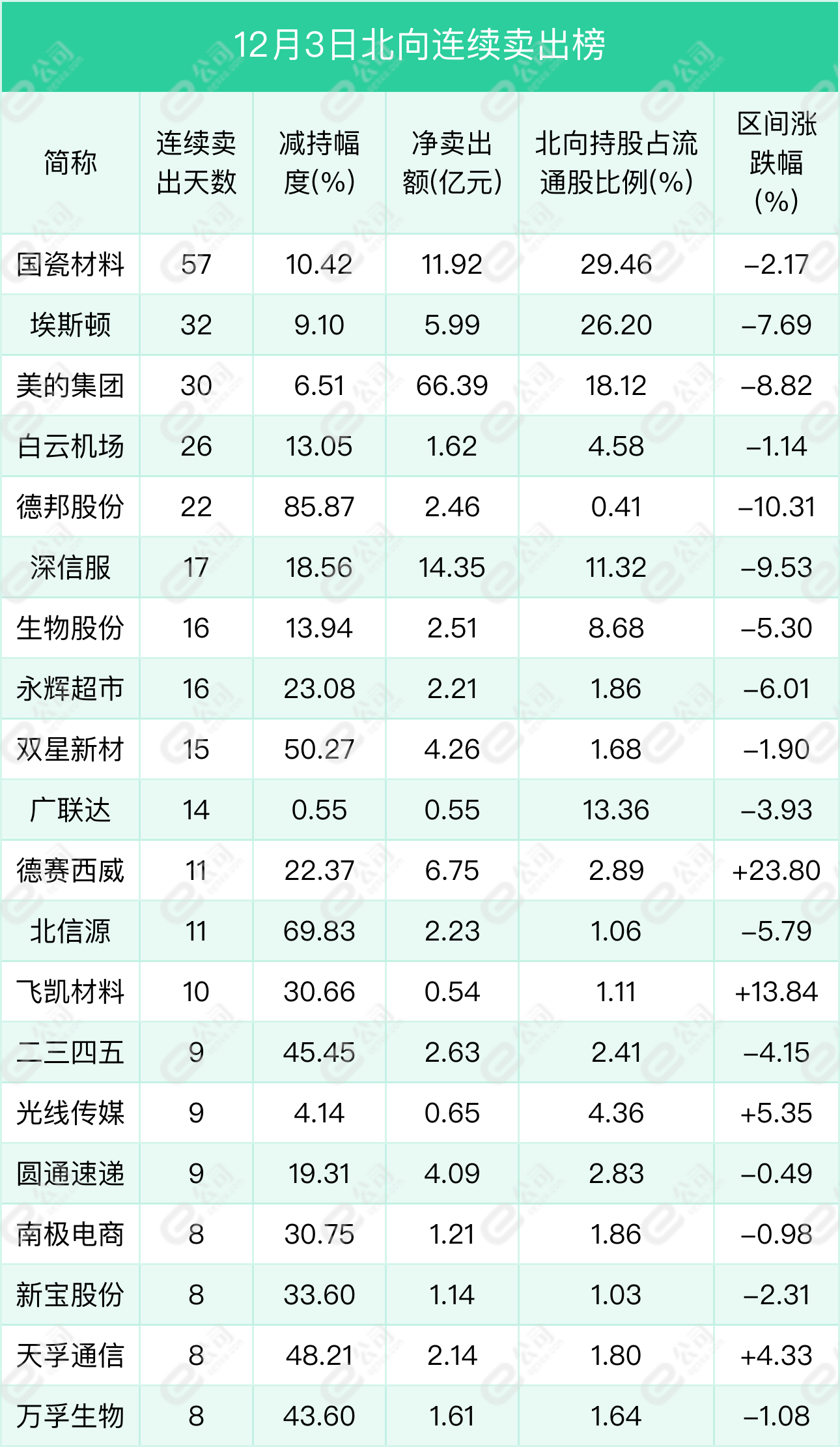 国瓷材料、埃斯顿、美的集团遭北向资金连续净卖出天数居前,分别为57天、32天、30天,期间净卖出额分别为11.92亿元、5.99亿元、66.39亿元,期间减持幅度分别为10.42%、9.1%、6.51%。