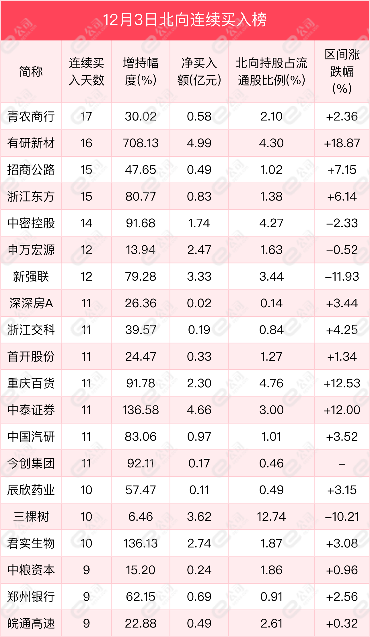 从连续买卖来看,青农商行、有研新材、招商公路获北向资金连续净买入天数居前,分别为17天、16天、15天,期间净买入额分别为0.58亿元、4.99亿元、0.49亿元,期间增持幅度分别为30.02%、708.13%、47.65%。