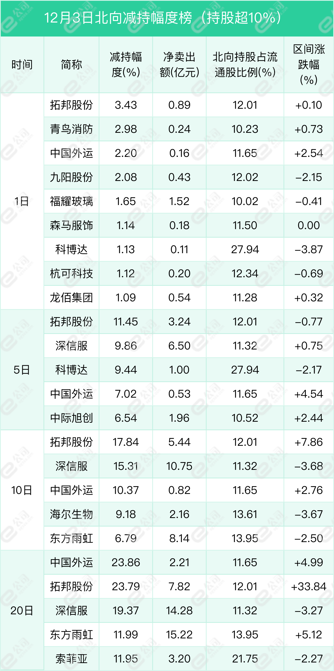 拓邦股份、青鸟消防、中国外运遭北向资金减持幅度居前,分别为3.43%、2.98%、2.2%。