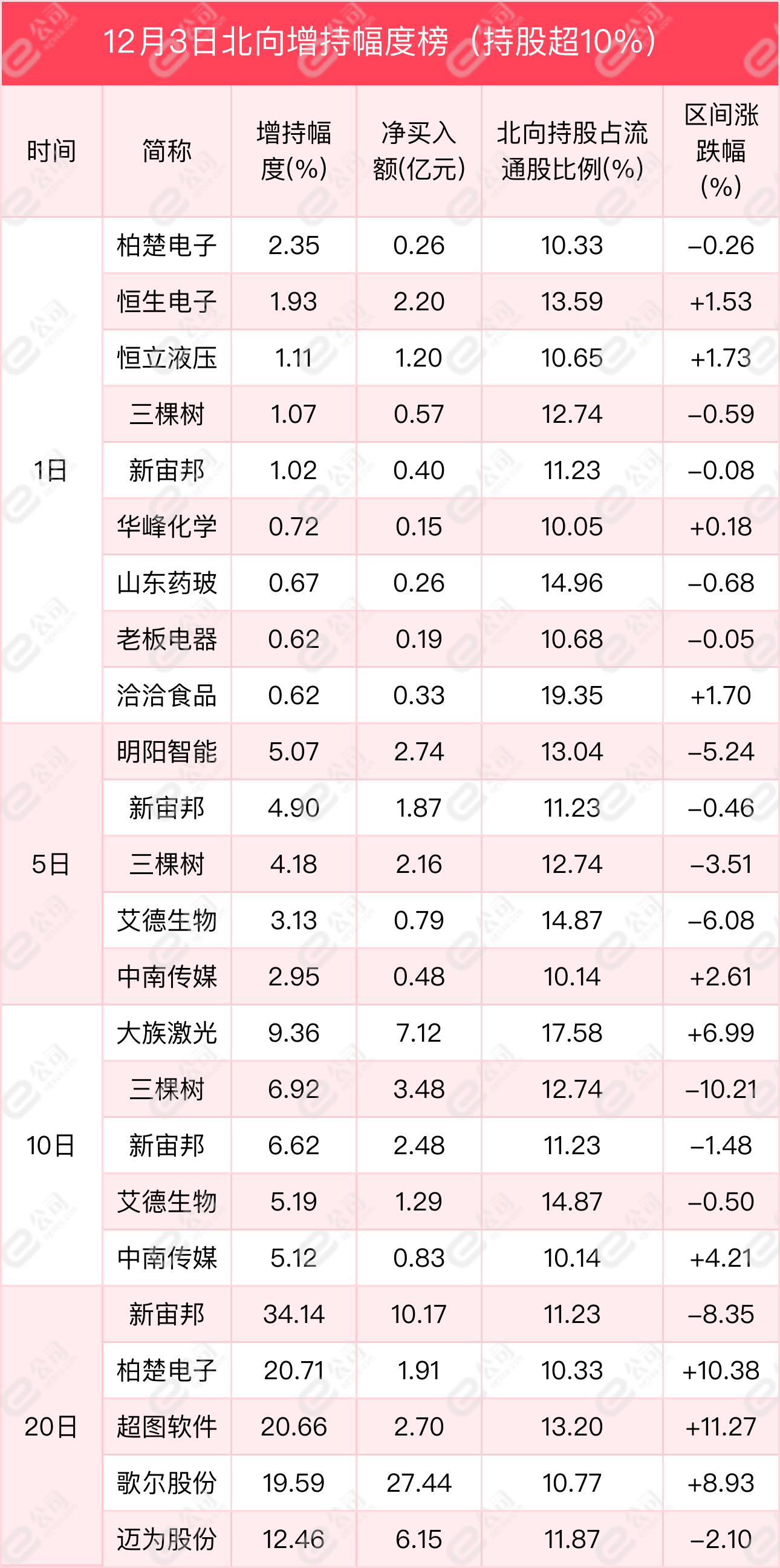 从增减持幅度来看,北向资金持股占流通股比例超10%的个股中,柏楚电子、恒生电子、恒立液压获北向资金增持幅度居前,分别为2.35%、1.93%、1.11%。