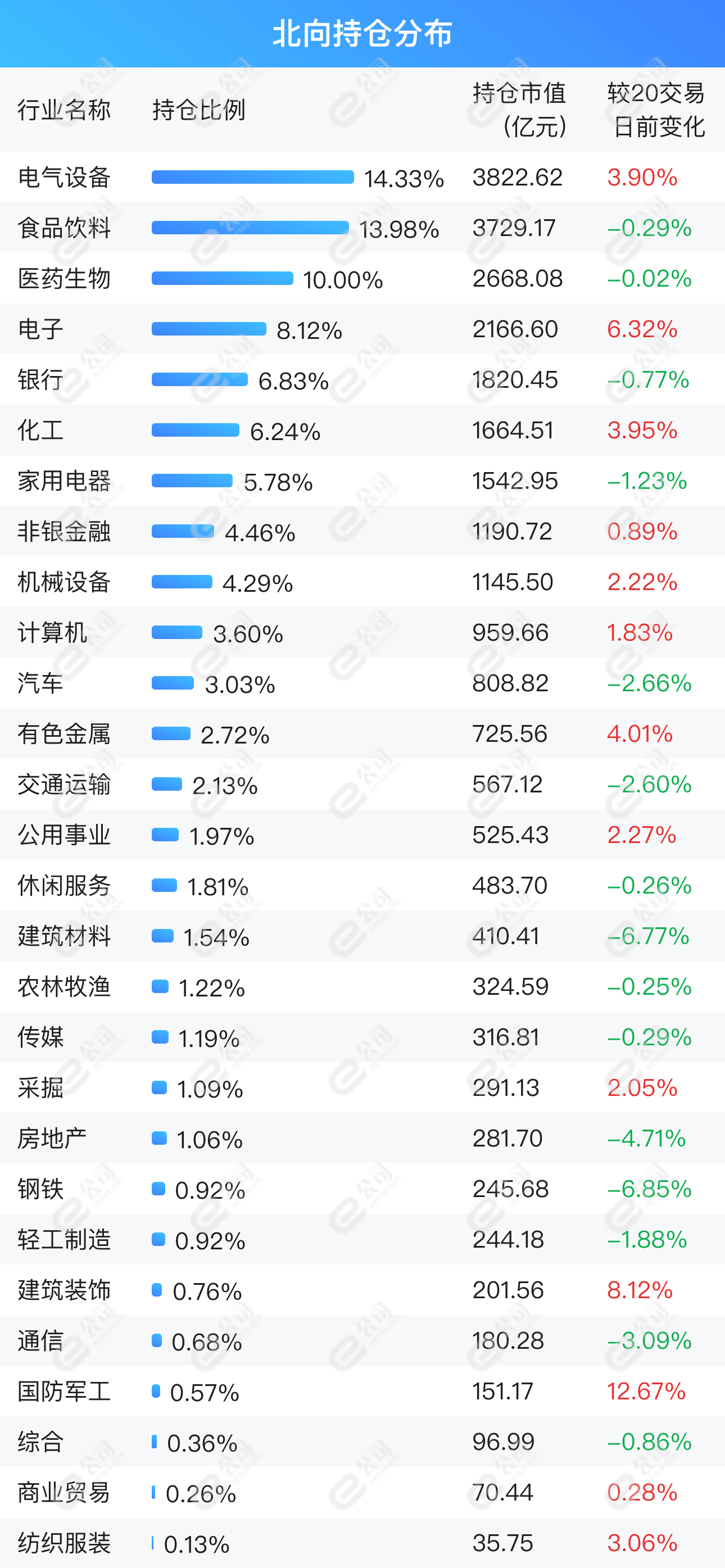北向资金持仓市值前五行业为电气设备、食品饮料、医药生物、电子、银行,占持仓总市值53.27%。
