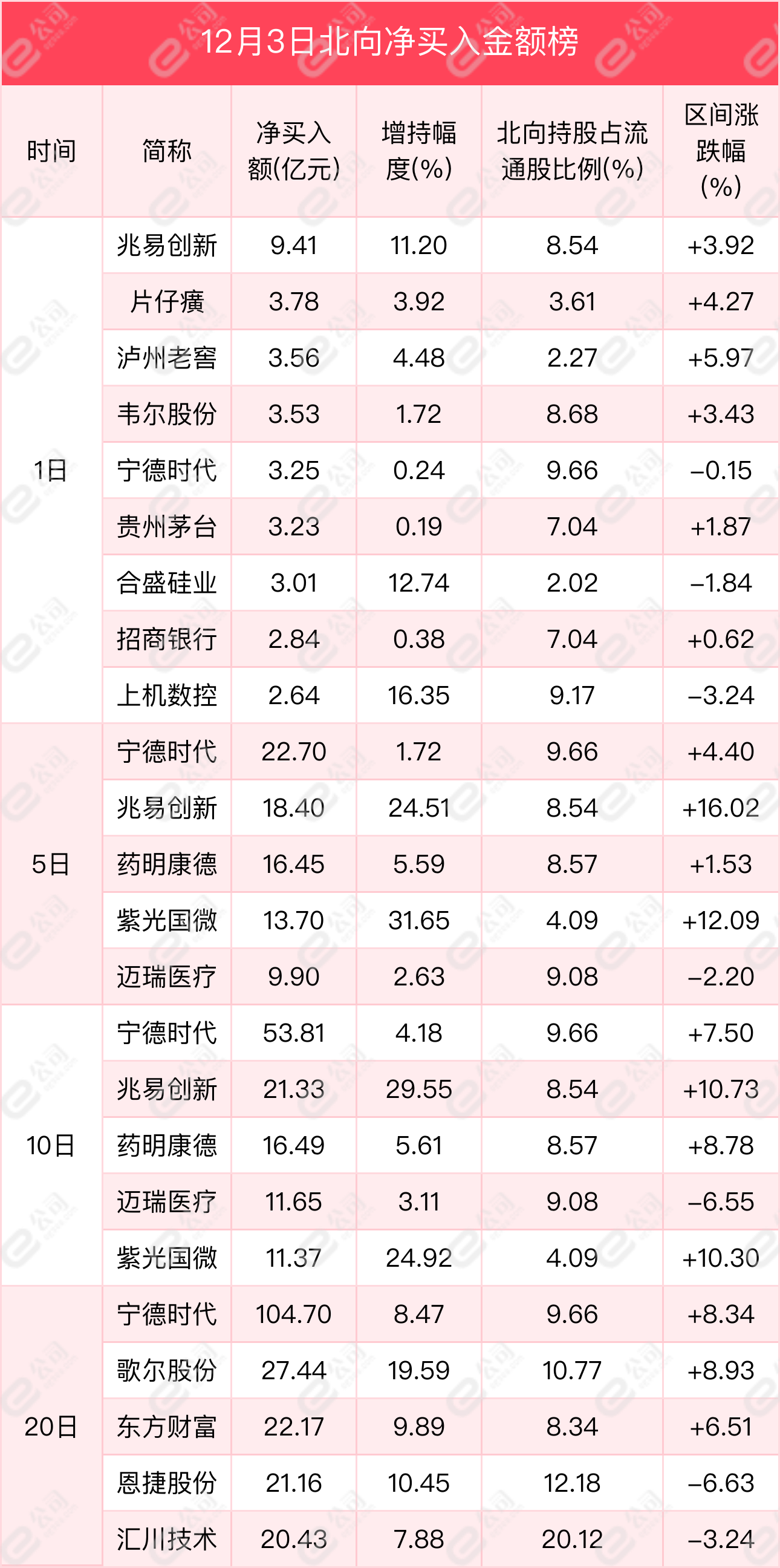 从买卖金额来看,兆易创新、片仔癀、泸州老窖获北向资金净买入金额居前,分别为9.41亿元、3.78亿元、3.56亿元,增持幅度分别为11.2%、3.92%、4.48%。
