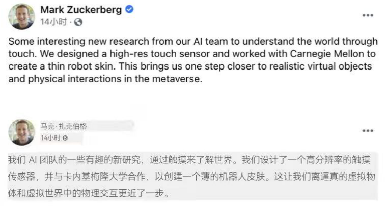 扎克伯格在Facebook发帖:“我们设计了一种高分辨率的触摸传感器,并与卡内基梅隆大学合作创造了一种薄薄的机器人皮肤。这使得我们更接近于在元宇宙中实现逼真的虚拟对象和物理交互。”