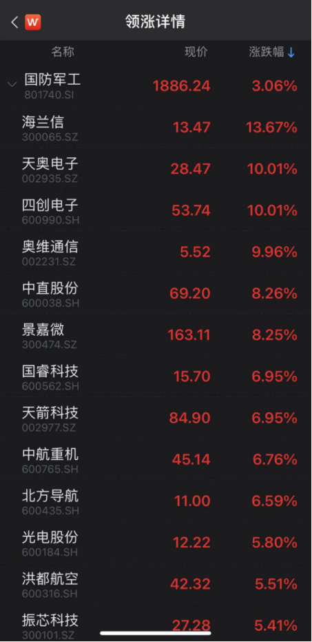 国防军工板块中,海兰信涨逾13%,天奥电子、四创电子、奥维通信涨停。