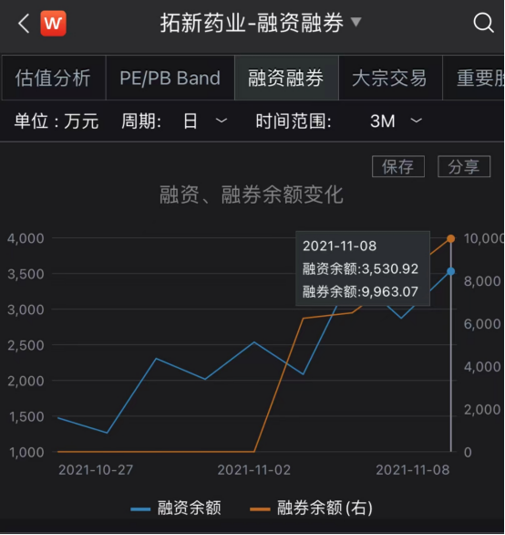 值得注意的是,近几日拓新药业融资余额、融券余额同向增长。截至11月8日,拓新药业融资余额为3530.92万元,融券余额为9963.07万元。