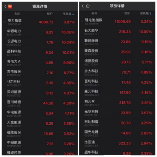 新能源相关的板块表现活跃。电力板块中,绿电概念股华银电力、长源电力、晶科科技、粤电力A涨停;锂电池板块中,石大胜华涨停,联创股份涨逾9%,豪森股份、诺德股份涨逾5%,其中石大胜华“两连板”。