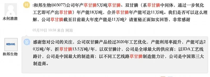据了解,目前和邦生物为满负荷生产状态,现不接草甘膦锁价长单。此前,公司在投资者互动平台表示,公司已经为全球最大的双甘膦供应商。2021年,公司双甘膦产品通过产能利用率提升,产能可达20万吨/年,折合草甘膦13.33万吨/年,在该产品的细分领域为中国第三大制造商、IDA工艺线路最大的制造商。公司表示,未来将持续保持自身领先地位,从成本质量及产能利用率提升着手,确保公司在该产品的市场地位。