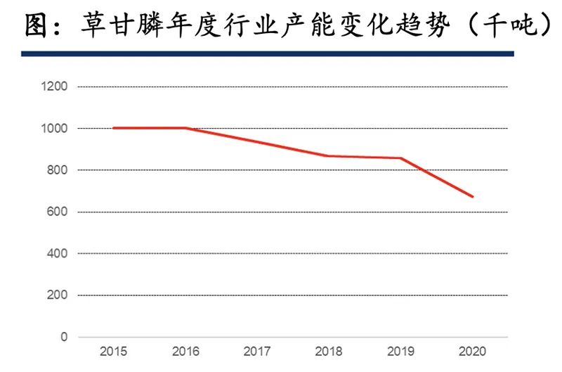 2015年至2020年期间,伴随着环保监管的不断深入,行业准入门槛不断提高,国内草甘膦的产能已由100万吨下降到67万吨左右。来源:中信证券研报