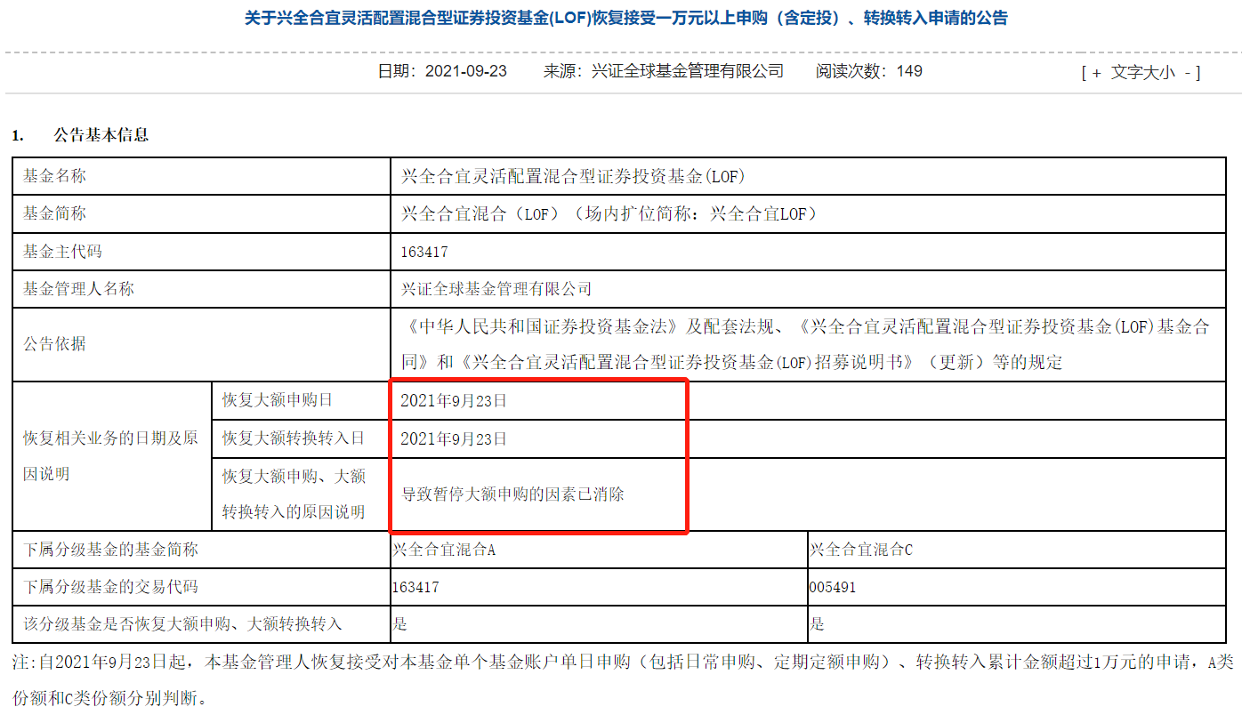 继上月,葛兰的中欧医疗健康上调单日申购上限额度之后,今日早间,兴证全球基金发布公告,知名基金经理谢治宇的两只基金——兴全合宜、兴全合润于今日(9月23日)起“恢复接受对本基金单个基金账户单日申购(包括日常申购、定期定额申购)、转换转入累计金额超过1万元/3千元的申请”,这也意味着这两只基金今日起将不再“限购”。