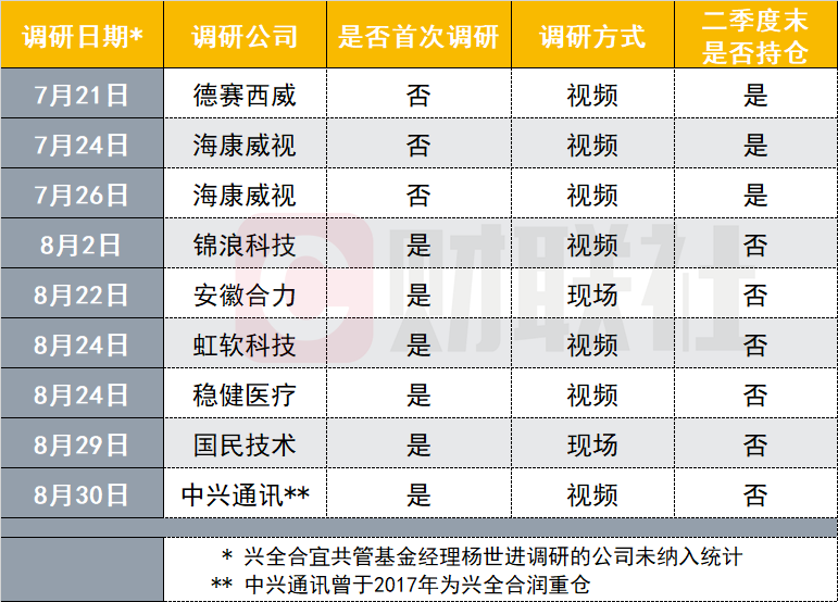 值得关注的是,自今年7月下旬起,谢治宇再度开启了他的密集调研之旅。截止目前上市公司已披露的投资者关系活动记录情况来看,三季度以来谢治宇亲自通过线上线下方式参与了9次上市公司调研。除“例行考察”海康威视、德赛西威这些已重仓的上市公司,他8月集中调研了包括安徽合力、虹软科技、稳健医疗等在内的6家“新面孔”,行业分布涉及芯片、医疗器械等领域,而这其中除了中兴通讯是兴全合润2017年曾经买过的股票之外,其它此前都不曾出现在各报告期持仓列表之中,不由得引发外界遐想。