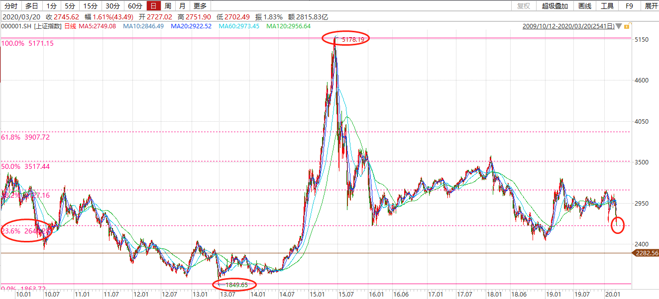 同时,我们再以1849为起点、5178为终点,来画一条黄金分割线,很明显,2646.80低点依旧处于黄金分割0.236分位附近,支撑力度之大,不言而喻。
