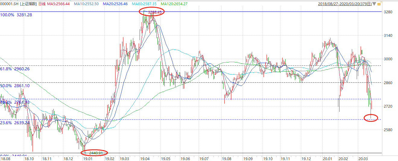 首先,我们以2440为起点、3288为终点,来画一条黄金分割线,可以很清楚的看到,大盘在跌至0.236分位附近时,技术派已经有明显的抄底动作,这也说明市场资金对这一位置的支撑较为认可。