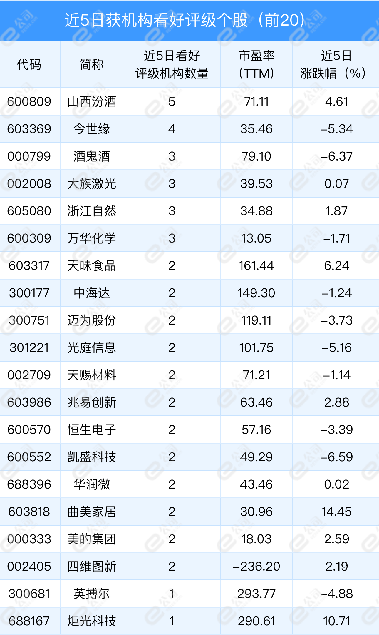 6只个股在近期被机构集中推荐,近5日内机构给予“买入”或“增持”等看好评级家数均逾3家及以上。具体来看,山西汾酒(5家)等1只个股近期机构看好评级家数居前,达到5家以上,此外,包括今世缘、酒鬼酒、大族激光、浙江自然、万华化学等在内的17只个股期间机构看好评级家数均在2家以上。