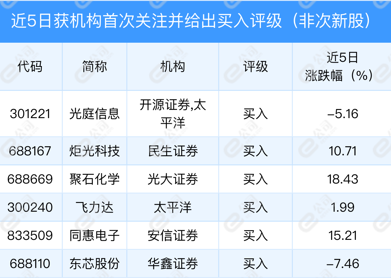 光庭信息、炬光科技、聚石化学、飞力达、同惠电子、东芯股份等在5日内获得机构首次关注并给出买入评级。