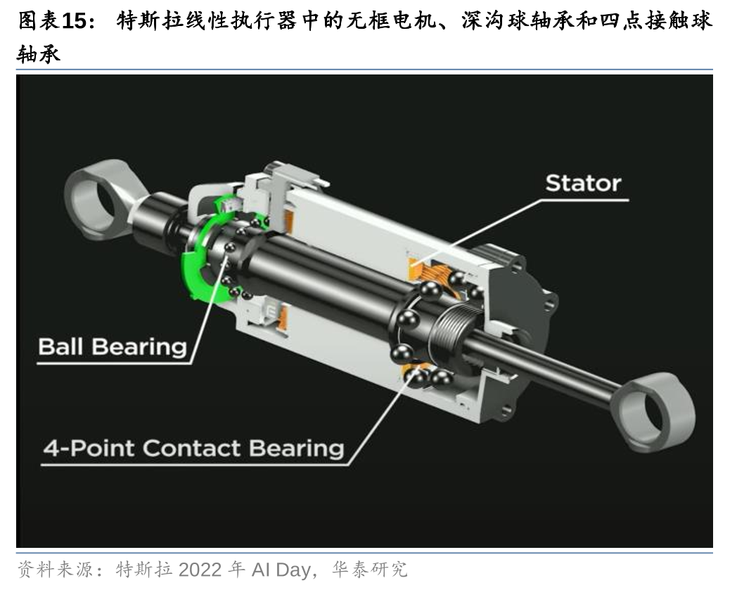 反式滚柱为特斯拉线性执行器中高价值量零部件。特斯拉人形机器人线性执行器由深沟球轴承、无框电机、力矩传感器、位置传感器(编码器)、反式滚柱和四点接触球轴承构成。