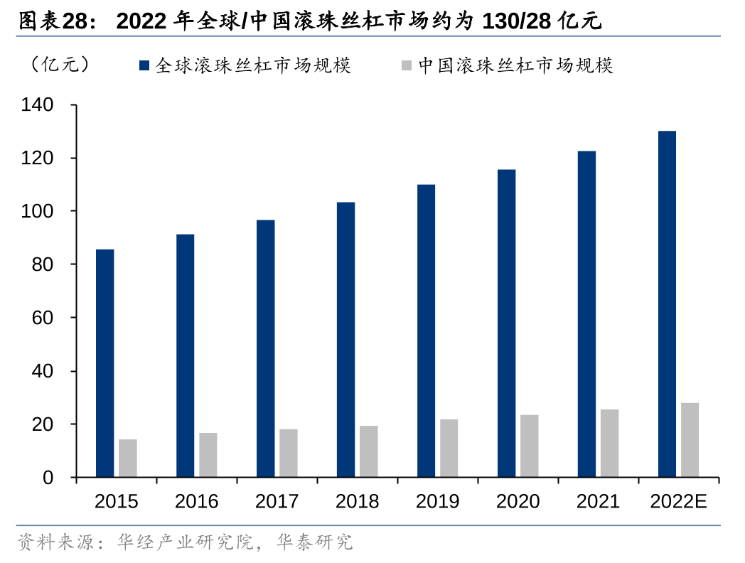 2022年全球/中国滚珠丝杠市场约为130/28亿元,日本和欧洲占据70%市场份额。根据华经产业研究院预测,2022年全球滚珠丝杠市场空间约为130亿元,中国滚珠丝杠市场空间约为28亿元。为了实现高速或精密的加工,除在机床设备的结构刚性进行加强设计外,必须同时具备高速主轴系统和高速进给系统,才能达到材料切削过程的高速化,这对于企业的制造能力和设计能力都有较高的要求。从市场竞争格局看,2021年全球主要的滚珠丝杆厂商有NSK、THK、SKF等,CR5市占率达到约46%,其中主要来自欧洲和日本,日本和欧洲滚珠丝杆企业占据了全球约70%的市场份额。国内做滚柱和滚珠丝杠的企业较少。