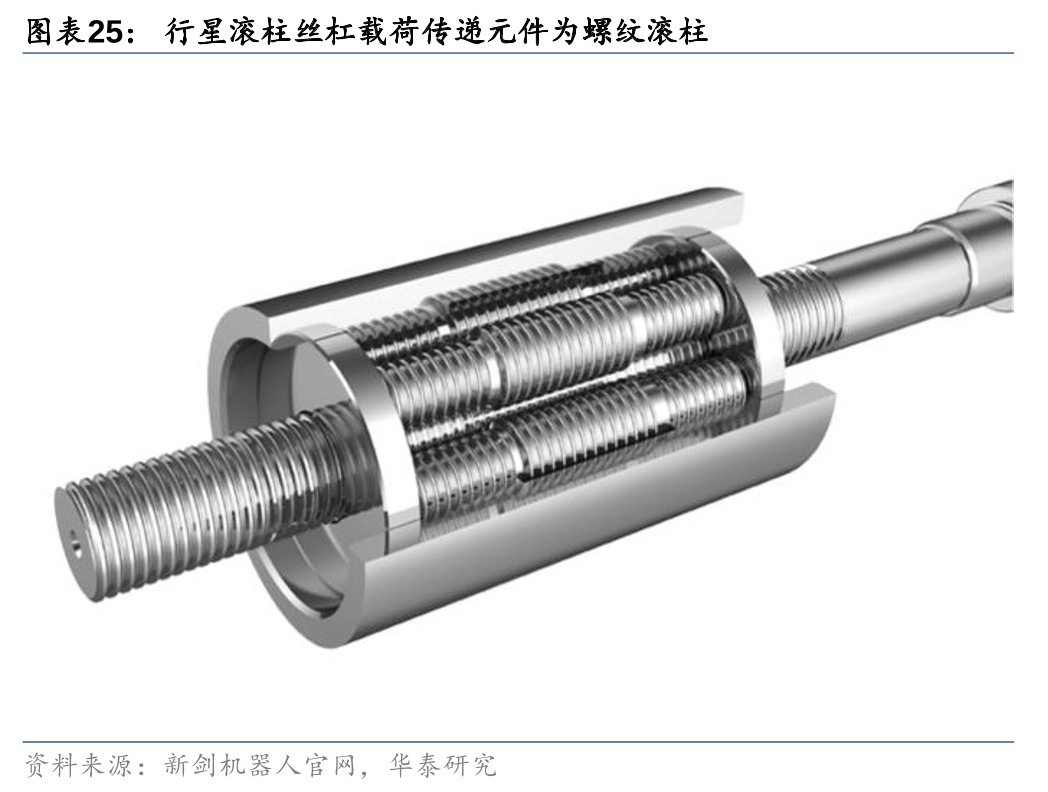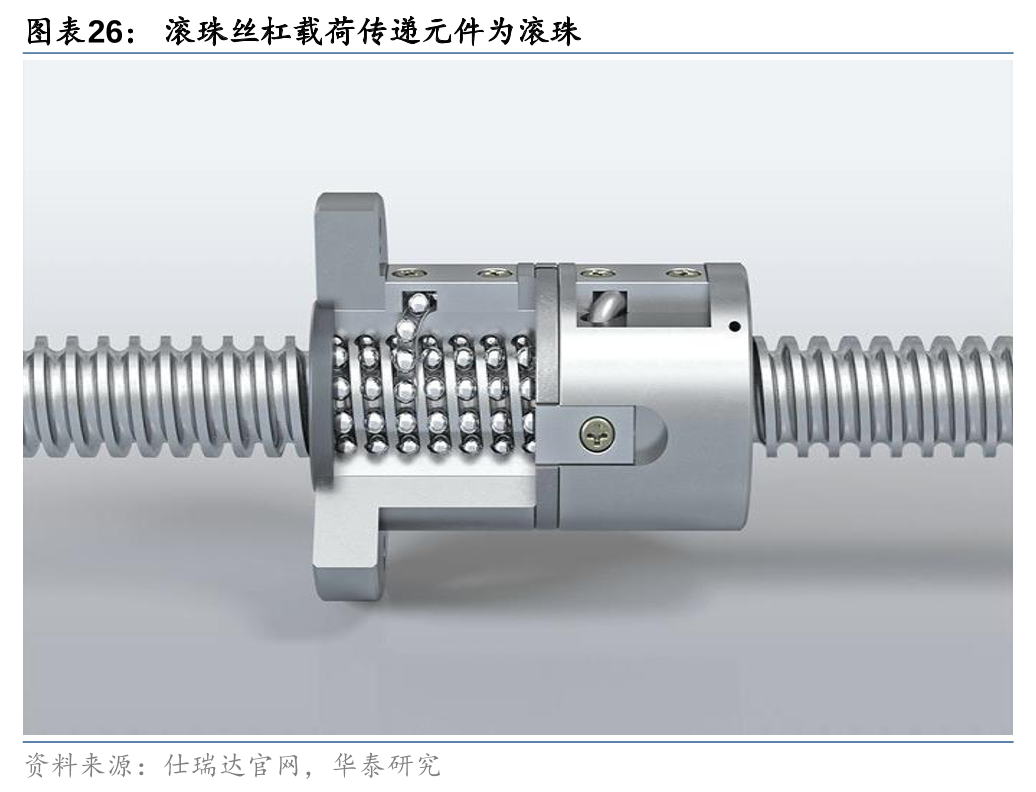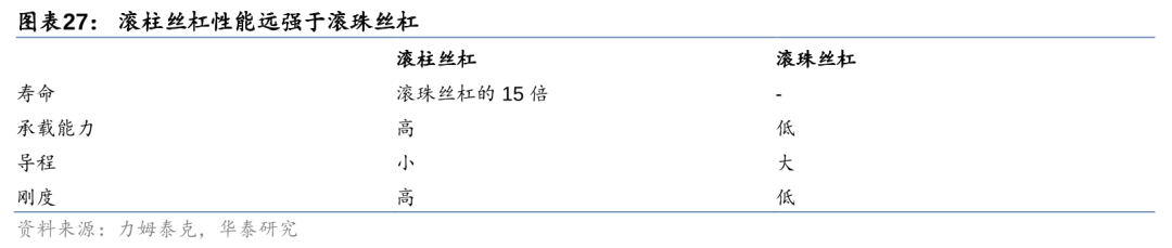 滚柱丝杠性能强于滚珠丝杠,反式滚柱尺寸更小。行星滚柱丝杆能承受的静载为滚珠丝杠的3倍,寿命为滚珠丝杆的15倍;螺纹滚柱替代滚珠将使负载通过众多接触点迅速释放,从而有更高的抗冲击能力;行星滚柱丝杠能够提供更高的旋转速度和更高的加速度;行星滚柱丝杠的导程可以比滚珠丝杠制造的更小,而滚珠丝杠的导程受到滚珠的直径限制;众多接触点将大幅度提高刚度和抗冲击能力。反式滚柱较传统的行星滚柱丝杠尺寸更小,未来滚柱丝杠有望凭借其优异性能持续替代滚珠丝杠。