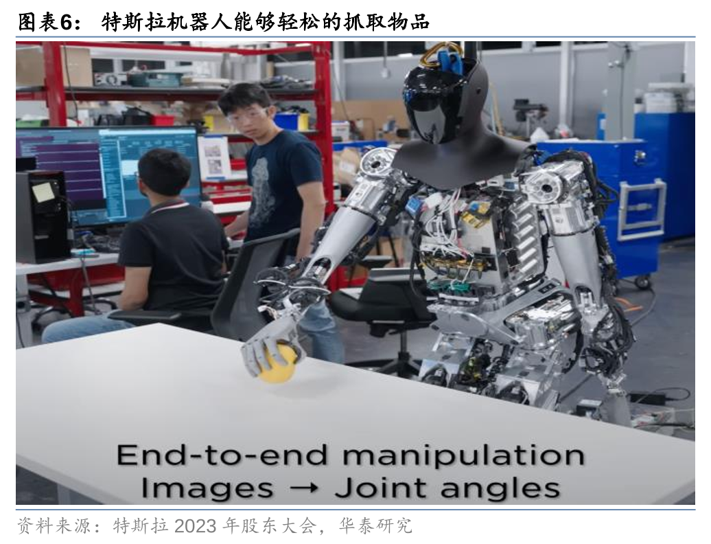 我们认为人形双足机器人为通用机器人的最优解,因为人类社会的种种事物都按照人类的生理结构进行设计的,为了适应种类多样的任务,达到通用的目的,贴近人类形态的双足机器人其隐形成本最小。2023年5月,特斯拉机器人腿部的末端关节能够在落地的同时不打碎鸡蛋,也能够轻松地抓取物品,证明其末端肢体关节的力矩控制能力有了显著的提高,增强了与人协同时的安全性。通过共用特斯拉汽车上的FSD自动驾驶系统,特斯拉机器人已经可以利用视觉自主识别、记忆周围环境,构建地图。工程师也可以通过AI对其进行肢体的模拟训练,大大降低了其开发成本。