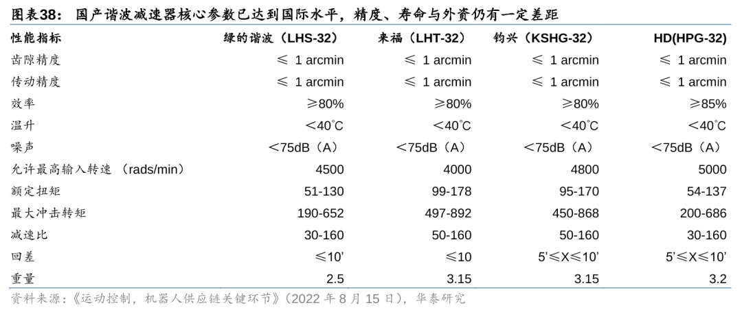 国产谐波减速器核心参数已达到国际水平,精度、寿命与外资仍有一定差距。在效率、减速比、传动精度、扭矩刚度等关键指标参数上,国产谐波减速器已经基本达到了国际领先的水平,但是在使用寿命、故障率等方面仍有差距。一部分国产减速器长时间使用后仍有出现磨损、漏油、精度下降的情况,在产品稳定性和使用寿命上仍需提升。减速器对技术积累要求非常高,细小的工艺差距会影响减速器的精度、损耗速度和寿命。打破海外技术壁垒的关键为设备和制造工艺:1)除了绿的谐波等企业通过工艺、材料的改进解决设备卡脖子问题外,加速提高国产精密设备制造水平仍为关键。2)减速器属于薄壁零件,如果热处理技术不过关,会导致零件变形较大。