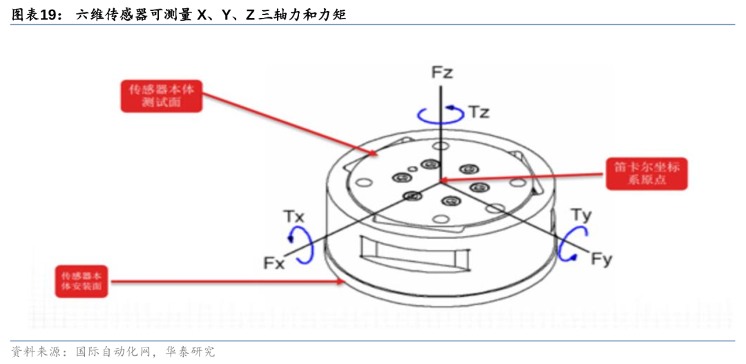 力矩传感器为机器人提供触觉,2022年全球市场空间为84亿美元。皮肤使得动物具有触觉,力矩传感器使得机器人具有触觉。力矩传感器是一种电子装置,用于监测、检测、记录施加在其上的线性力和旋转力,常用于打磨、抛光碰撞检测等领域。根据Market Insight,2022年全球力矩传感器市场空间为84亿美元,约600亿元。按照测量维度上分,力矩传感器可分为一维至六维传感器,其中六维传感器可测量X、Y、Z三轴力和力矩。