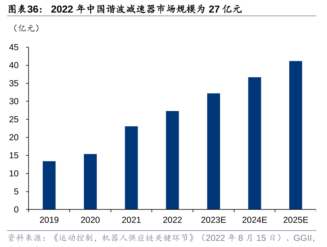2022年中国谐波减速器市场规模为27亿元,国产替代趋势明显。参照我们发布的报告《运动控制,机器人供应链关键环节》(2022年8月15日)中的测算方式,按照单台工业机器人使用3台谐波减速器,每台谐波减速器为3000元,结合GGII披露的2022年中国工业机器人销量30.3万台,我们测算出2022年中国谐波减速器市场规模为27.3亿元。2021年绿的谐波市场占有率为26%,较2018年的20%显著提升,国产替代趋势明显。