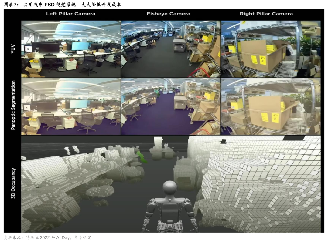 共用汽车FSD系统,特斯拉机器人已能够识别、记忆周围环境。通过共用特斯拉汽车上的FSD自动驾驶系统,特斯拉机器人已经可以利用视觉自主识别、记忆周围环境,构建地图。工程师也可以通过AI对其进行肢体的模拟训练,大大降低了其开发成本。
