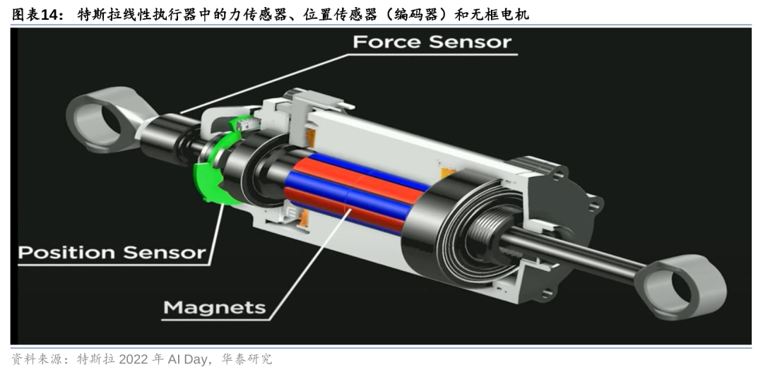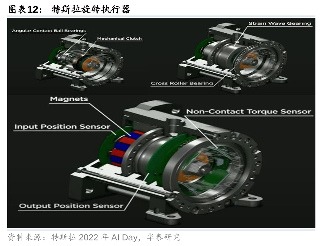 力矩传感器、谐波减速器、无框电机和编码器为旋转执行器重要零部件。特斯拉旋转执行器由角接触轴承、谐波减速器、交叉滚子轴承、编码器、无框电机、力矩传感器构成,其中编码器、无框电机、减速器和力矩传感器价值量高于其他零部件。