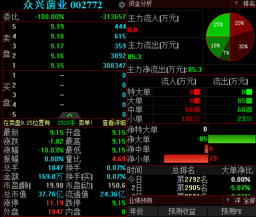 10月18日,众兴菌业开盘跌停,报9.15元,跌停板上封单逾30万手。
