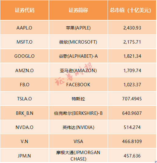 表1:标普500前十大市值上市公司。截止时间2021年8月6日