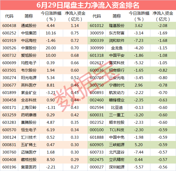 从个股尾盘资金流向数据看,有8股尾盘净流入资金超过5000万元,通威股份、中恒集团、中远海控等个股尾盘资金净流入金额最多,分别高达1.14亿元、0.75亿元、0.72亿元;隆基股份、东方财富、润和软件等个股尾盘资金净流出金额最多。