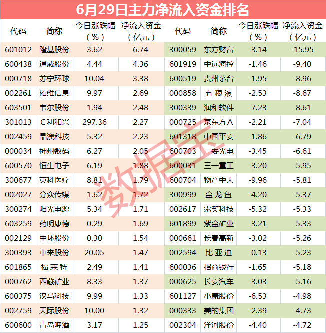 沪指6月29日下跌0.92%,主力资金全天净流出539.63亿元,已连续24个交易日资金呈净流出状态。其中,创业板主力资金净流出121.09亿元,沪深300成份股主力资金净流出219.96亿元。