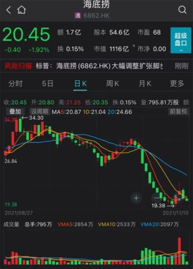 消息面上,海底捞近日发布公告表示,集团决定在2021年12月31日前逐步关停300家左右客流量相对较低以及经营业绩不如预期的海底捞门店。