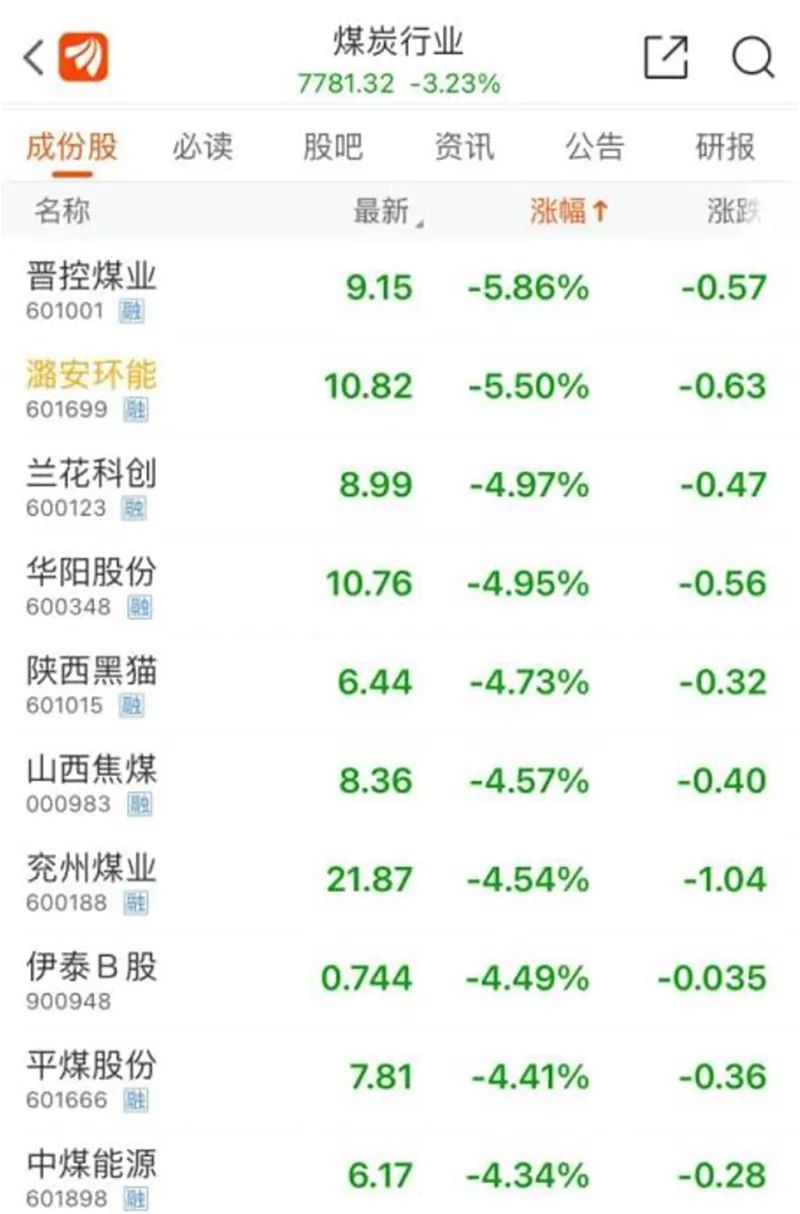 早盘,煤炭股领跌两市,晋控煤业、潞安环能跌逾5%,兰花科创、陕西黑猫、兖州煤业等纷纷跟跌。