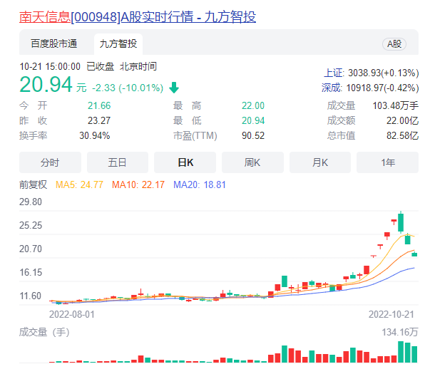 但是更多高位股出现退潮迹象,其中昨日7连板英飞拓在经历全天的震荡后最终跌超7%,南天信息、恒久科技、华塑控股、科远智慧等更是在盘中被砸停。