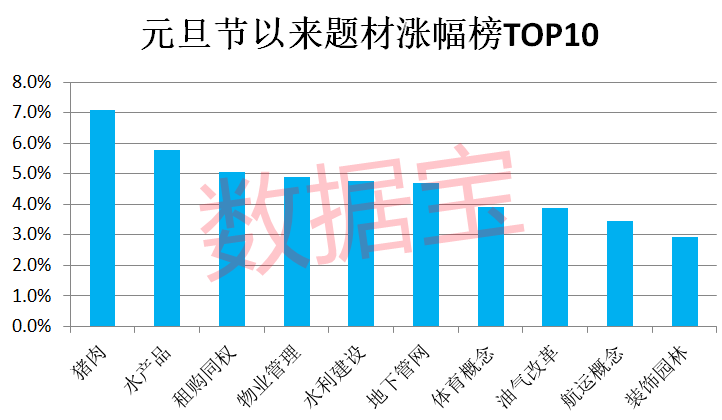 从元旦节后的五个交易日整体来看,涨幅最高的前五大题材分别是猪肉、水产品、租购同权、物业管理、水利建设,猪肉指数累计涨幅7.08%排在第一位。同期市场主要指数如深证成指、上证指数、沪深300、创业板指等均为下跌状态,其中创业板指跌幅达到6.83%。