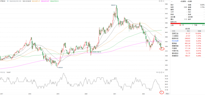 同时,沪深300指数来看,目前也已跌至4月27日对应的低点,且PSY指标也重新回到25低位,同样也已经处于相对底部状态。